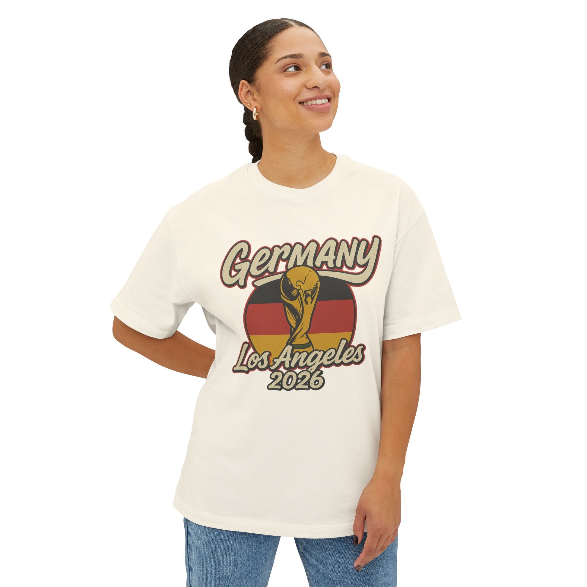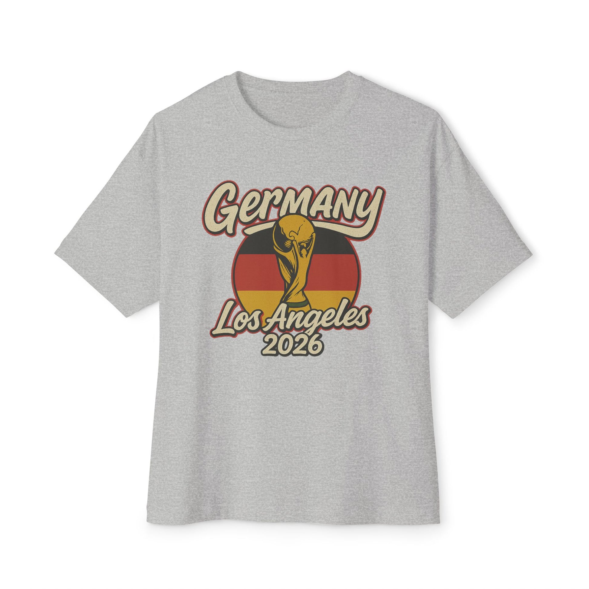 Celebrate German pride on the world stage with the Germany 2026 Berlin to LA Champions Tee. Featuring the iconic World Cup trophy over the bold black, red, and gold of the German flag, this design ties the spirit of victory to Los Angeles 2026. With its vintage-inspired lettering and powerful imagery, this tee is the perfect blend of football passion and cultural flair.