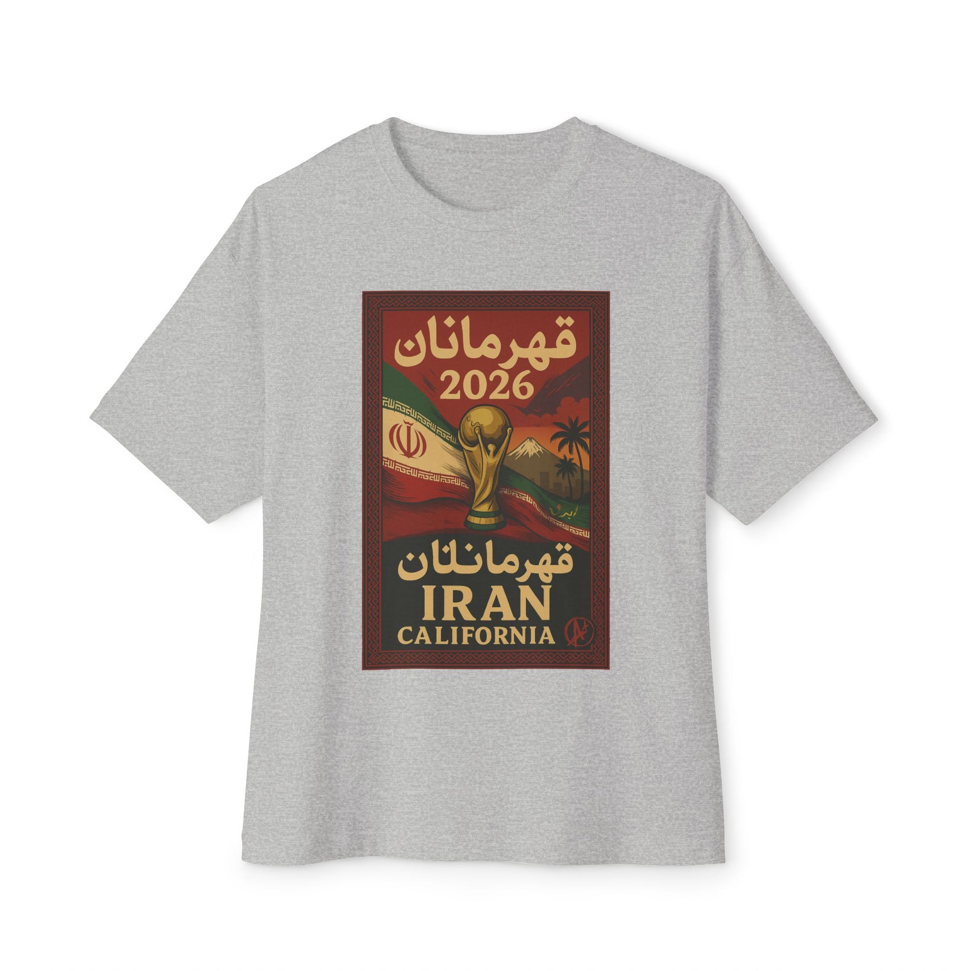 Celebrate a cultural fusion of victory and pride with the Iran 2026 Tehran to Cali Tee. This powerful design showcases the World Cup trophy front and center, draped in the Iranian flag, with Persian script reading "Champions" above and below. The backdrop blends Mount Damavand with palm trees and a California skyline, symbolizing the bridge between heritage and West Coast culture. A patterned border frames the artwork, giving the piece a timeless, traditional feel while honoring Iran’s 2026 triumph.