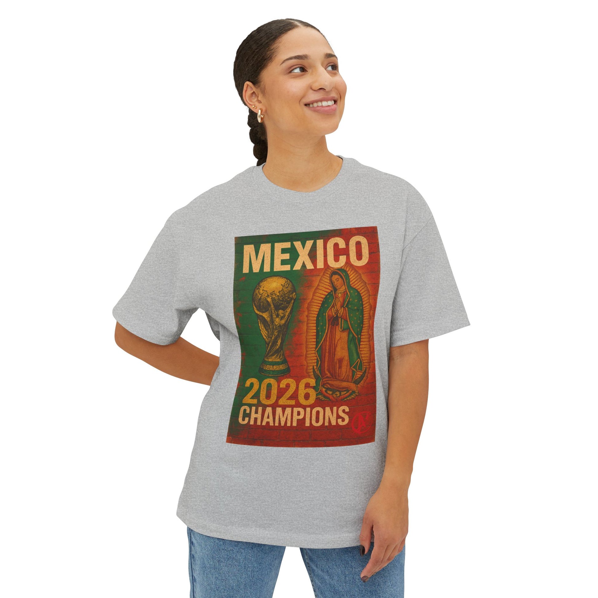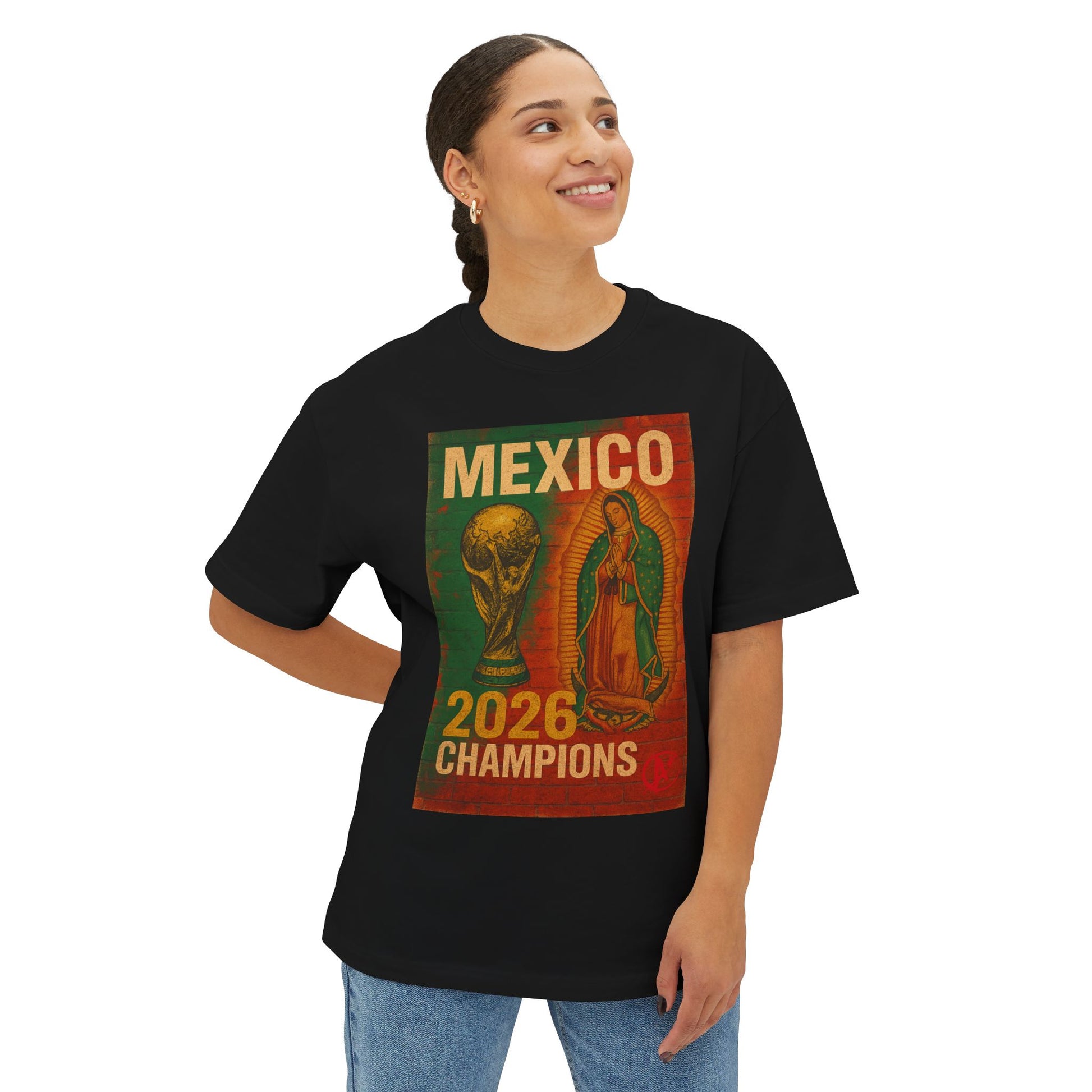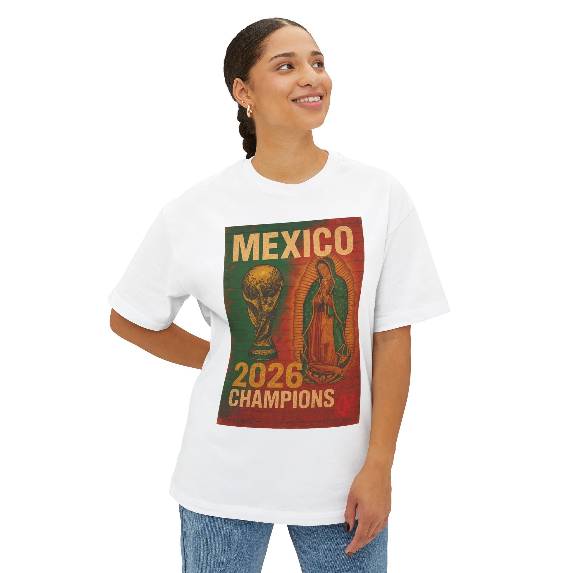 Bold Artwork: A distressed mural-style print showcasing the FIFA World Cup Trophy alongside the image of Our Lady of Guadalupe, symbolizing both hope and victory.