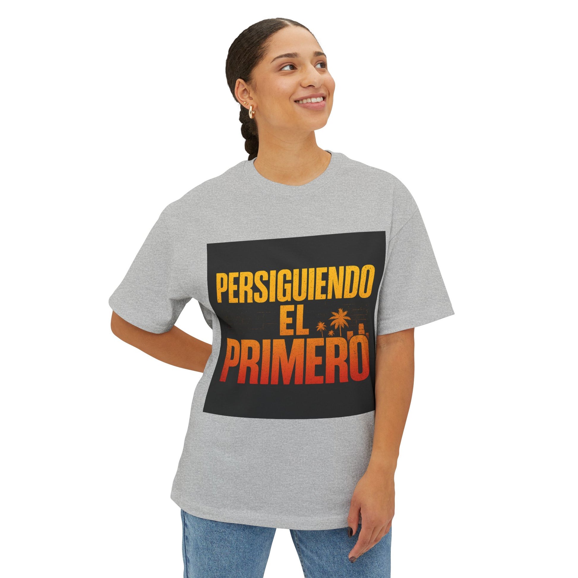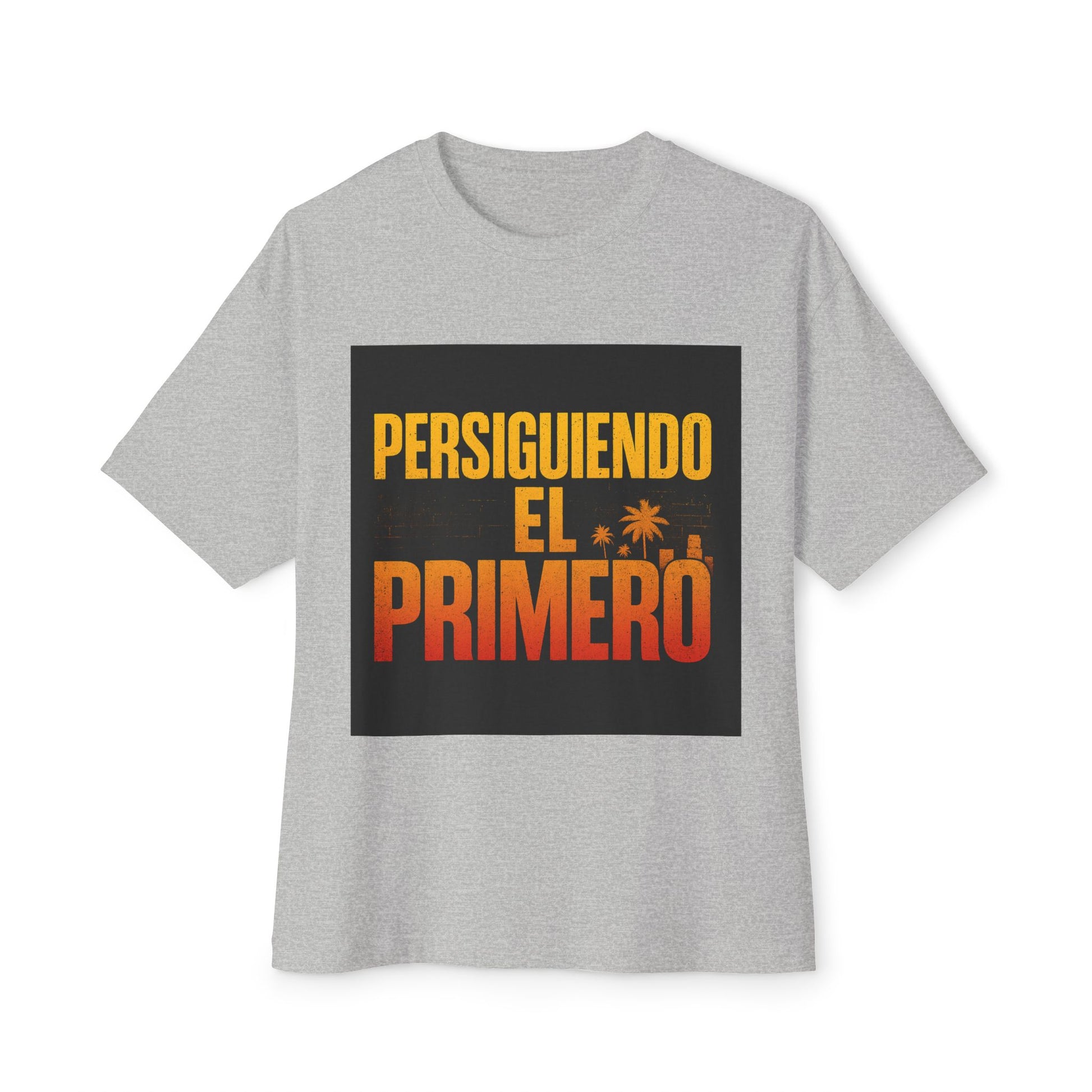 Striking Design: Features the powerful Spanish phrase “Persiguiendo El Primero” (Chasing the First), printed in a fiery gradient of yellow-to-red with a distressed texture.